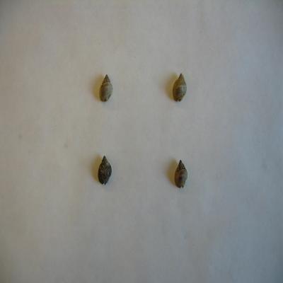 Cuatro ejemplares. Concha ovalada, de ápice alto. Costillas y estrías axiales. Parduzca con franjas espirales claras. Sutura marcada. Boca oval, apuntada por arriba y abierta por abajo. Pliegue sifonal escotado hacia atrás. Gran columela a modo de escudo liso, plano y blanco. Interior pardo con franjas espirales claras.