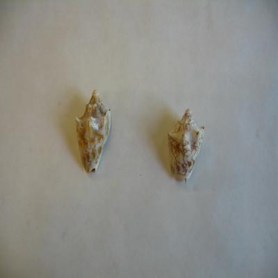 Dos ejemplares. Concha oval-alargada, pesada, de espira no muy alta. Ápice romo con espiras con púas. Las púas del canto se conectan con las costillas axiales. Estrías axiales. Color blanco con dibujos irregulares pardo o pardo oscuro. Boca alargada, más ancha por abajo. Labio externo con el borde parduzco internamente, y una prolongación en la parte superior que corresponde al perfil de una de las púas. Interior blanco. Coumela blanca, con cuatro pliegues. Pliegue sifonal escotado la izquierda.