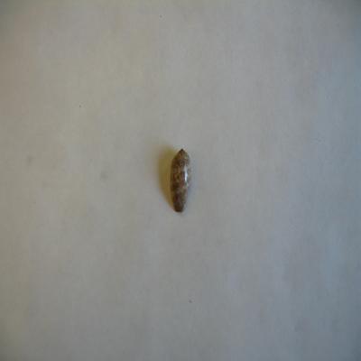 En una cajita, con un papel con inscripción a bolígrafo: "Pseudoliva sp. en mal estado. 1 ejemplar".