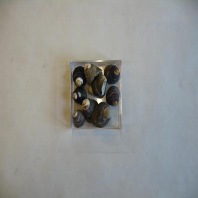 9 ejemplares. Concha cónica, gruesa, de espiras redondeadas. Estrías axiales. Color negruzco con manchitas blancas, aunque en algunas se ha ido parte de la capa superficial y se observa una inferior blanca nacarada. Boca redondeada, interior blanco, nacarado.