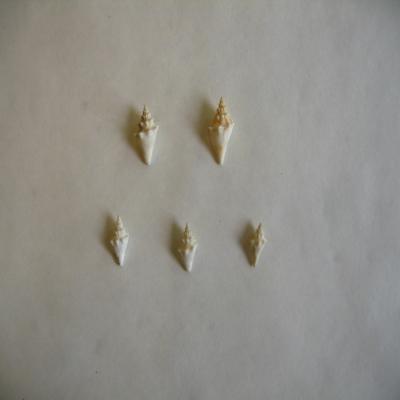 5 ejemplares. Concha fusiforme, de ápice elevado. Fila espiral de púas romas en el canto de cada espira. Estrías espirales. Color blanco, una con líneas axiales pardas. Boca alargada, más amplia por la parte superior. Columela blanca lisa. Interior blanco.