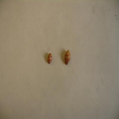Molusco. Clase Gasteropoda. O. Neogasterópodos. Fam. Columbellidae 2 ejemplares. Concha piriforme, pequeña, y ápice no muy alto. Color claro con frnajas axiales pardas. Boca alargada, puntiaguda por arriba. Labio externo ancho, dentado internamenre. Columela fuertemente estriada. Interior claro.