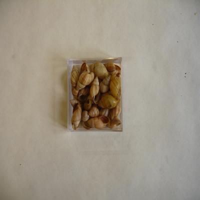 Más de veinte ejemplares. Concha oval-fusiforme, delgada ligera. Ápice elevado, espiras redondeadas. Estrías axiales. Color parduzco, con franjas axiales más oscuras. Boca semicircular, más estrecha por arriba. Columela a modo de callosidad lisa blanca.