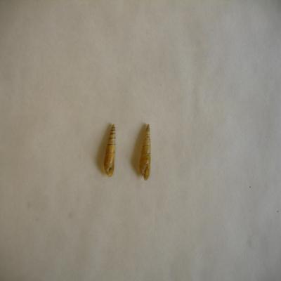 Dos ejemplares. Concha cónico-piramidal, muy alta, a modo de torre. Ápice redondeado. Estrías axiales. Color amarillento, superficie fina, translúcida. Boca más o menos ovalada, más estrecha por arriba. Interior amarillento, translúcido.