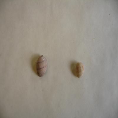 Molusco. Clase Gasteropoda. Subcl. Opistobranchia. Fam. Bullidae Dos ejemplares. Cocha vesiculiforme, espira hundida, no visible. Estrías axiales. Una blancuzca con manchas pardas, bastante desgastada, la otra violácea con manchas pardo-violáceas y dos franjas espirales violáceas. Boca tan larga como la concha, más amplia por abajo. Interior blanco. Columela formada por una especie de callosidad lisa, blanca. Ambas están rotas, y la más grande tiene la boca tapada con sustrato.