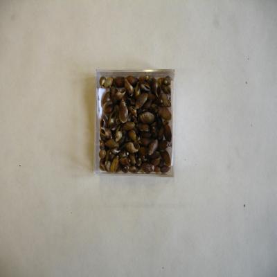 Molusco. Clase Gasteropoda. Subclase Neogastropoda. Fam. Thiaridae Más de cuarenta ejemplares. Concha pequeña, ovalada, de ápice bajo. Estrías axiales, color pardo, ápice color claro. Boca ovalada, apuntada por arriba. Columela lisa, blanca. Interior pardo.