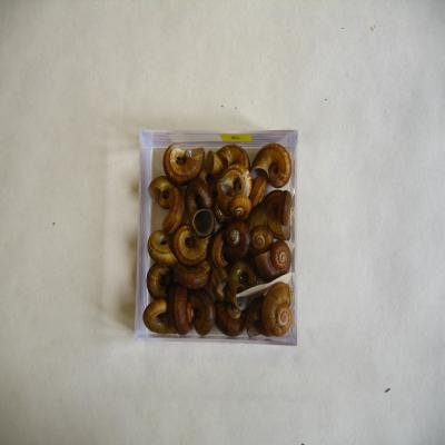 Cerca de treinta ejemplares. Concha espiralada, ligera, de ápice bajo. Estrías axiales. Coloración parda con franjas espirales más oscuras y líneas espirales más claras. Boca circular, con interior claro. Las espiras forman una especie de ombligo ancho y profundo.
