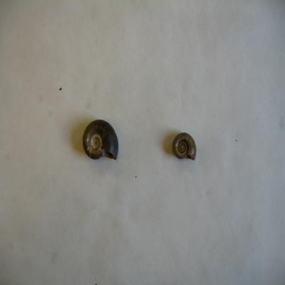 Dos ejemplares. Conchas espiraladas, pero planas por ambos lados. Espira algo involuta, y por el otro lado una especie de ombligo ancho. Las espiras van aumentando el grosor. Estrías axiales. Pardo oscuro con líneas espirales más oscuras. Boca ovalada más o menos, con interior claro, con las líneas espirales oscuras.