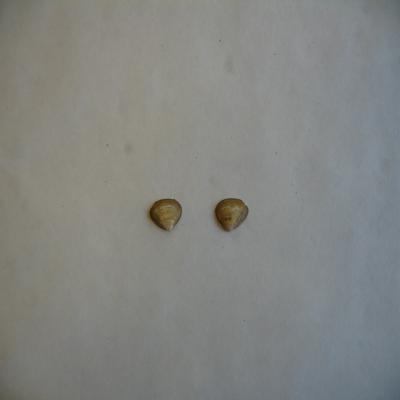Las dos valvas que corresponden al mismo ejemplar. Valvas simétricas, forma triangular-oval. Umbo elevado. Estrías concéntricas de crecimiento. Parduzca. Interior blanco, con el centro más amarillento, con seno paleal.