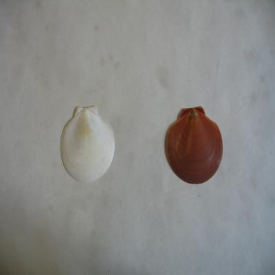 Dos ejemplares. Valva bastante plana, fina, ligera, forma circular. Superficie lisa, se observan líneas de crecimiento concéntricas y finas estrías radiales. Aurículas que parecen iguales. Una blanca y otra rojiza. En la cara interna, de color interna (con el centro rojizo en la de color), se observan pares de costillas radiales.