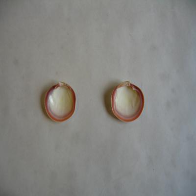 Molusco. Clase Pelecypoda. Subcl. Heterodontia. Fam Lucinidae Las dos valvas que pertenencen al mismo ejemplar. Forma redondeada, valvas simétricas, algo aplanadas. Umbo bajo e incliando. Costillas radiales y marcas concéntricas de crecimiento. Color blanco con zonas violáceas, sobre todo cerca del borde y el umbo. Interior claro, con el centro amarillento y los laterales rosados. Una marca muscular más larga que la otra.