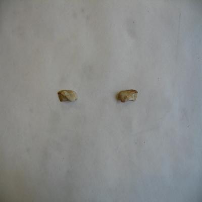 Dos valvas que pertenecen al mismo ejemplar. Simétricas, trapezoidales, con costillas radiales y estrías concéntricas de crecimiento. Umbo casi en un extremo e inclinado, y un lado mucho más alargado. Color blanco sucio. Interior blanco. Cierre recto, con dientes iguales. Borde dentado.