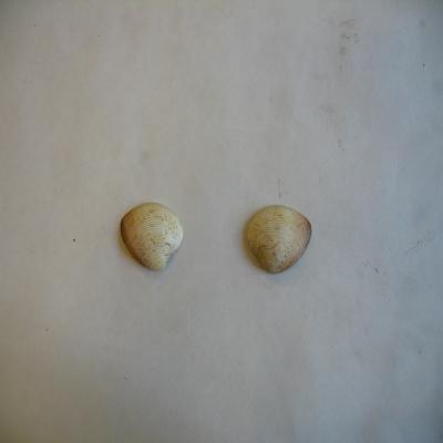 Las dos valvas que pertenecen al mismo ejemplar. Valvas simétricas, triangular-ovales, con el umbo inclinado y un lado más recto y apuntado. Costillas concéntricas. Color blanco cremoso, con dibujos y zonas pardas. Interior blanco brillante, con gran seno paleal y dos marcas musculares.