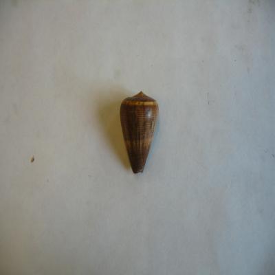 Un ejemplar. Concha cónica, pesada, espiral baja y aguda. Estrías axiales. Color pardo oscuro con franjas espirales más claras. Boca alargada y estrecha. Interior blanco con el borde del labio externo pardo.