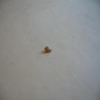 Un ejemplar. Concha pequeña, cónica, de espira baja y aguda Estrías axiales, y estrías espirales cerca de la zona axial. Blanca con líneas espirales de machitas pardas, y en algunas zonas manchas pardas. Boca alargada, interior claro.
