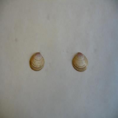 Molusco. Clase Pelecypoda. Subcl. Heterodonta. Fam. Veneridae. Las dos valvas que corresponden al mismo ejemplar. Valvas simétricas. Forma triangular redondeada, con el umbo alto e inclinado. Costillas concéntricas, y una serie de costillas onduladas cerca del umbo. Color crema con dibujos pardos y la zona del umbo violácea. Interior blanco, con la zona centrla rosa-violácea. Sin seno paleal, y dos marcas musculares.
