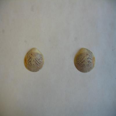 Molusco. Clase Pelecypoda. Subcl. Heterodontia. Fam Veneridae Las dos valvas que pertenecen al mismo ejemplar. Valvas simétricas. Forma triangular-oval, umbo algo inclinado. Finas costillas concéntricas. Color blanco sucio con dibujos como en zig-zag violáceos, y una mancha parda en un lado. En uno de los laterales cerca del umbo, manchas violáceas en el borde. Interior blanco, con manchita oscura cerca del umbo. Sin seno paleal, dos marcas musculares.