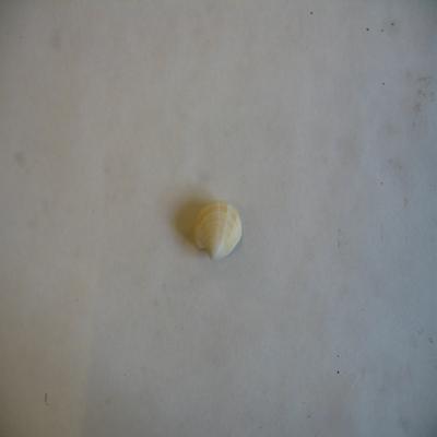 Ejemplar completo que aún se mantiene unido, algo abierta. Valvas simétricas, redondeadas, con el umbo inclinado. Finas costillas concéntricas. Color blanquecino con franjas radiales color crema. Interior blanco, con gran seno paleal y dos marcas musculares.