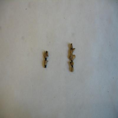 Cnidario. Clase Antozoos. Dos fragmentos de coral rígido, formado por un esqueleto negro, encima una capa también rígida color blancuzco con rayas longitudinales y encima una capa áspera que cubre todo, algo amarillenta, con los agujeritos dejados por los pólipos.