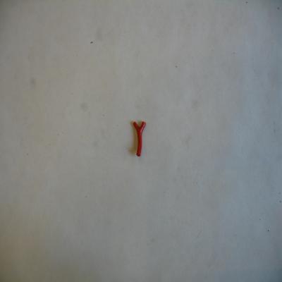 Esqueleto córneo de coral, es una rama que se ramifica en dos en el extremo superior. Superficie lisa brillante, color rojo vivo. En una de las caras se observan dos agujeritos.