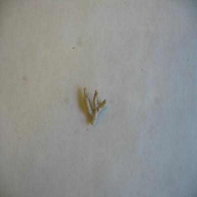 Cnidario.Clase Antozoos. Subcl. Zooantarios (Hexacoralarios). Madreporario. Parte de esqueleto rígido de coral colonial. Forma ramificada, textura áspera, color blanco con agujeritos por toda la superficie correspondientes a los pólipos.