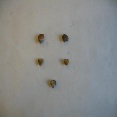 Cinco ejemplares completos unidos, algo fosilizados. En general forma triangular-oval o redondeada. Una de las valvas posee una especie de vértice que cubre un poco la otra valva. En general costillas radiales. Colores grisáceos o pardos. Superficies bastante deterioradas.
