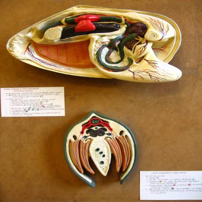 Sobre un cuadro. Las diferentes partes en ambos modelos están numeradas con rotulador. Hay dos etiquetas (una por modelo) blancas, grandes, con inscripción con bolígrafo. La del corte sagital dice: "CLASE BIVALVOS O LAMELIBRANQUIOS. Estructura interna", y las diferentes partes descritas con su número correspondiente. La etiqueta del corte transversal dice: "CORTE ESQUELÉTICO TRANSVERSAL", y la descripción de las diferentes partes con su número correspondiente.