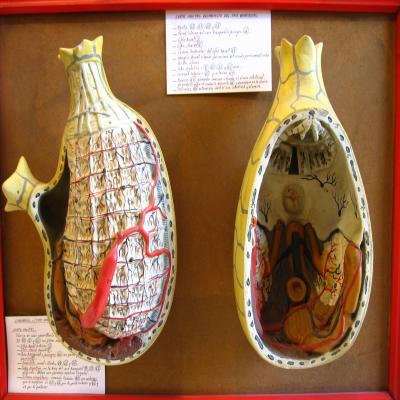 Cordado. Protocordado. Subfilo Urocordado (Tunicados). Clase Ascidiáceos. Fam Molgulidae Modelos anatómicos de ascidia. Hay dos cortes, uno un corte sagital, y otro también es un corte sagital pero desprovisto de saco branquial. Las diferentes partes están numeradas en ambos modelos. -Corte sagital con saco branquial: túnica, manto (30,6 y 21) con sus fibras musculares (5 y 7), sifón bucal (3) y cloacal (4), saco banquial o faríngeo (36) con poros y hendiduras branquiales (8), endostilo (29, 31 y 36), el tubo digestivo (9,10 y 11) con el ano (12) y el hígado, sistema circulatorio con el corazón tubular (20) y arterias que se ramifican (28, 21, 22 y 24). -Corte sagital desprovisto del saco branquial: Manto (32,21,29 y 23), pared interna del saco branquial o faríngeo (26), sifón bucal (3), sifón cloacal (4), corona tentacular del sifón bucal(19), ganglio dorsal, tubo digestivo (9,10,11) con el ano (12), corazón tubular (20) y arterias (24), ovario (15), conducto deferente (16) y testículos (17).