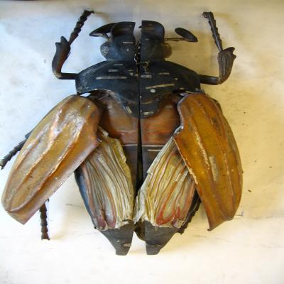 Invertebrado. Artrópodo. Hexápodo. O. Coleoptera. Fam. Scarabaeidae Modelo anatómico de un escarabajo. Se puede desmontar en dos piezas, separándose por el plano sagital. Los élitros también se pueden abrir, quedando al descubierto las alas. Cada parte, tanto externa como interna posee una pequeña etiqueta con un número, o más comúnmente con el nombre de lo que es (en francés). Está muy bien conservado, parece que está completo. Las dos mitades están unidas por enganches metálicos. El interior muestra los diferentes órganos y sistemas con todo detalle, nombrando cada parte.