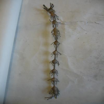 Invertebrado. Artrópodo. Modelo del sistema nervioso de un artrópodo (articulado), en el estado de larva. Es una cadena nerviosa tipo escala de cuerda, con lo que parecen diez concentraciones nerviosas a lo largo de la cadena. Es un cordón nervioso doble con ganglios y conexiones transversales en cada segmento. Los ganglios de algunos segmentos son a menudo grandes, e incluso pueden fusionarse. Primero se ve un anillo, con dos nervios que aquí están separados formando el anillo, y posteriormente siguen siendo dos, pero se van juntando entre ellos. De cada concentración nerviosa salen pequeñas ramas laterales.