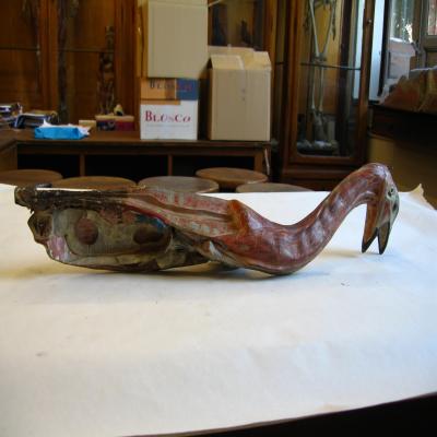 Vertebrado. Ave. Modelo anatómico de ave, no desmontable. Se observa la anatomía interna, tanto muscular como los órganos. Cada parte está señalada con una etiqueta con un número. Muy detallado, incluso con vasos sanguíneos. Está muy deteriorado, con la superficie desquebrajada. No incluye las extremidades.