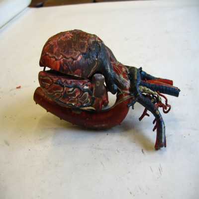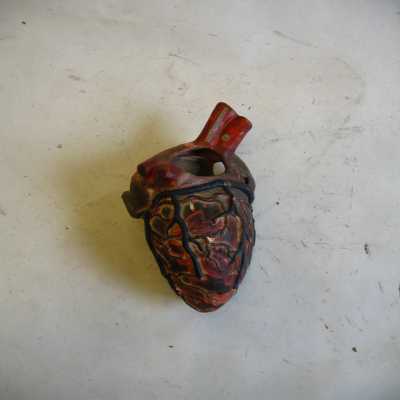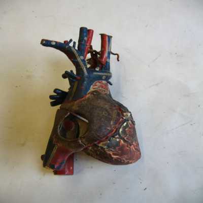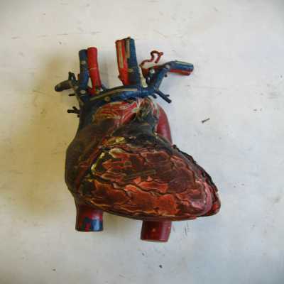 Vertebrado. Mammalia. Eutheria. Orden Primates. Fam. Hominidae Modelo de corazón humano. Grande, muestra los vasos sanguíneos principales (aorta, vena cava, vena pulmonar, carótidas..). El corazón se puede dividir en dos piezas, como si dejasen a un lado cada pieza una aurícula y un ventrículo. Cada pieza puede abrir un pequeño compartimento, mostrando en su interior las válvulas cariacas. La pieza pequeña muestra la válvula mitral, mientras que la grande (posee las arterias y venas) contiene la tricúspide. También se observa el agujero de Botal, la válvula de Eustaquio y el canal arterial (características del corazón de feto).