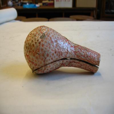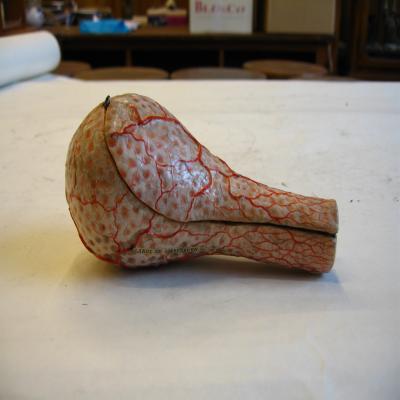Modelo anatómico de una glándula de Lieberkühn, situada en el intestino delgado, y son las encargadas de producir el jugo intestinal. Tiene forma redondeada, con superficie granulosa, con bastantes vasos y capilares sanguíneos por la superficie. Se puede dividir en dos partes, lo que permite ver el interior. Interior hueco, a modo de saco.