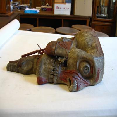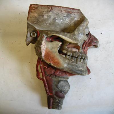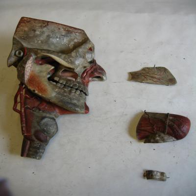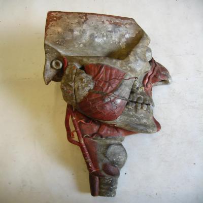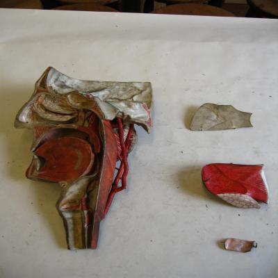 Modelo anatómico de cara humana. Grandes proporciones, representa un corte longitudinal de la cara, mostrando la anatomía interna, principalmente de la boca, y nariz. Se descompone en 4 piezas, permitiendo ver la estructura interna: