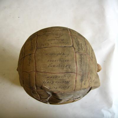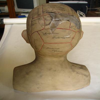 Parece corresponder al modelo de cabeza frenológica que aparece en el inventario del material científico de la Cátedra de Filosofía realizado en 1946. Podría corresponder a uno de los 11 modelos anatómicos clásicos que formaban parte de la colección zoológica según las memorias del curso académico 1877-78.