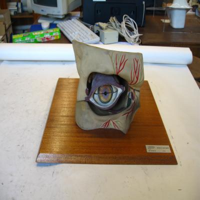 Sobre un soporte de madera, con una placa con inscripción "ENOSA. MODELO ANATOMICO OJO. EN 429016".