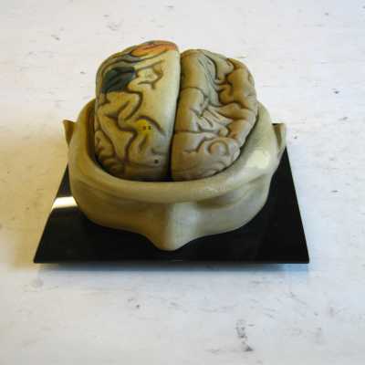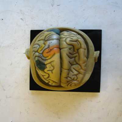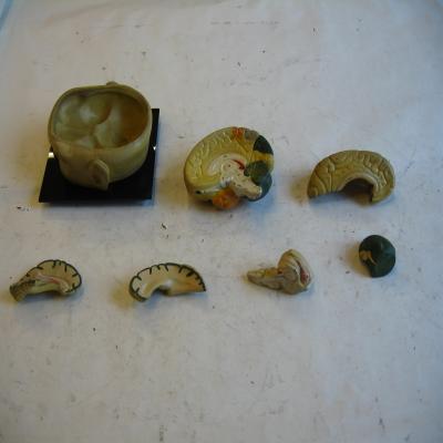 Modelo de encéfalo humano. Tamaño ajustado a la realidad. Una sección transversal de la cabeza hace como de cuenco, en el que se asienta el encéfalo. Se puede desmontar en 7 piezas, lo que permite observar su anatomía interna y las diferentes partes. Los dos hemisferios se pueden separar y luego uno de ellos se separa en más piezas. También se puede observar la anatomía interna del cerebelo y del tronco raquídeo.
