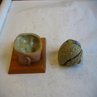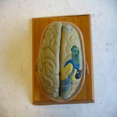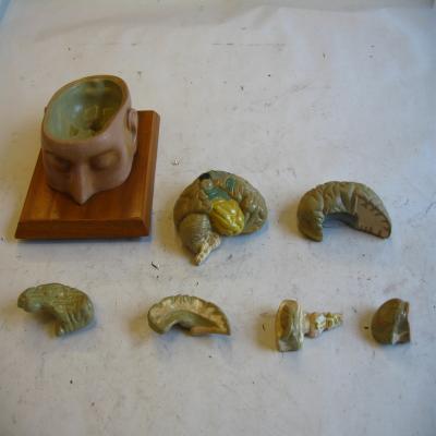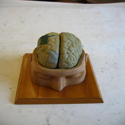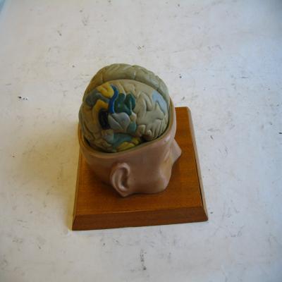Modelo de encéfalo humano. Tamaño ajustado a la realidad. Una sección transversal de la cabeza hace como de cuenco, en el que se asienta el encéfalo. Se puede desmontar en 7 piezas, lo que permite observar su anatomía interna y las diferentes partes. Los dos hemisferios se pueden separar y luego uno de ellos se separa en más piezas. También se puede observar la anatomía interna del cerebelo y del tronco raquídeo.