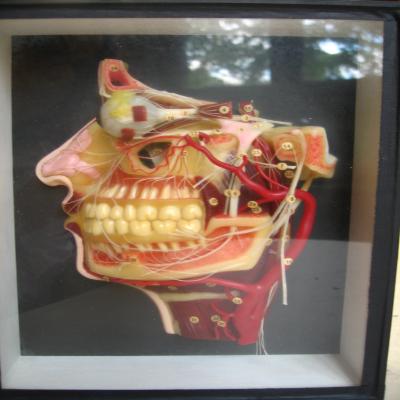 Modelo anatómico de la cara humana. Dimensiones cercanas a la realidad. Es de perfil, un lado de la cara sin piel, desde la frente (sin el cerebro) hasta el cuello, mostrando su anatomía interna. Está representado principalmente los vasos sanguíneos y sobre todo los nervios que hay en la cara. Se puede ver con detalle los nervios (importante el nervio trigémino, que transmite las sensaciones desde la cara hasta el cerebro) que llegan al ojo, la nariz y la boca. En la boca se pueden ver los dientes, las encías, y como en la base de cada diente hay un pequeño capilar sanguíneo y un nervio. También se pueden ver los músculos del cuello.