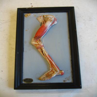 Modelo anatómico de la extremidad posterior humana, cara externa. Escultura en relieve que muestra tanto los músculos como los huesos desde la pelvis hasta el pie. Se observa algo de los huesos de la pelvis, fémur, tibia, peroné y del pie. También se representan los vasos sanguíneos y los nervios.