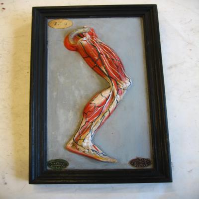 Modelo anatómico de la extremidad posterior humana, cara interna. Escultura en relieve que muestra principalmente los músculos interiores de la pierna. También se ve un poco de hueso, lo que parece la tibia, y huesos del pie. Se observa la parte final del intestino, desembocando en el ano. Vasos sanuíneos que recorresn toda la pierna hasta el pie y nervios.