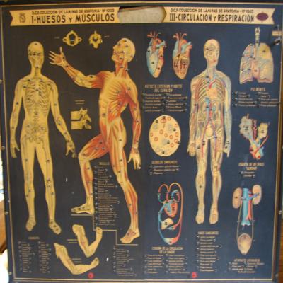 Cuadro electrificado de anatomía y fisiología humanos de grandes dimensiones. Está dividido en dos mitades: a la izquierda los huesos y los músculos y a la derecha muestra la circulación y respiración. En el cuadro se representan varios dibujos: un esqueleto humano completo, un hombre de perfíl mostrando los músculos, varios huesos y músculos, otro en vista frontal mostrando el sistema circulatorio y respiratorio, dos cortes del corazón, dibujo de células sanquíneas, otro del sistema circulatorio, pulmones, lóbulo pulmonar y del aparato urinario.