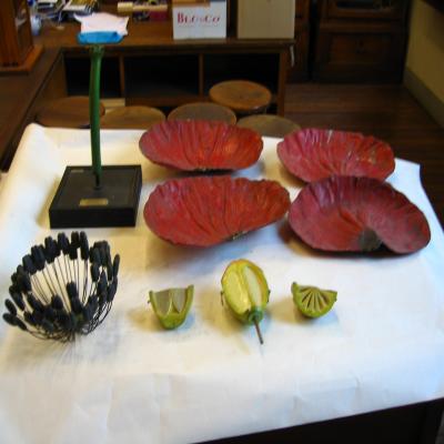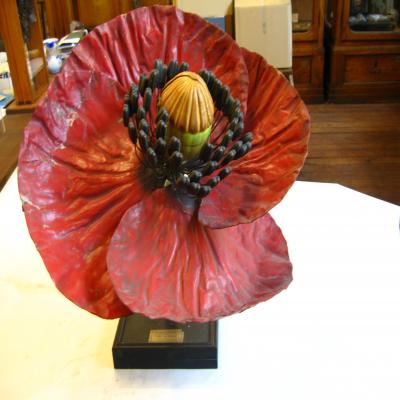 Modelo de gigantescas dimensiones de una flor de la amapola. Flor con cuatro pétalos iguales de color rojo escarlata, base a menudo negra y muchos estambres en círculo con anteras azuladas. Pétalos superpuestos en la base. Ovario súpero, obovado, con estigmas en forma de disco con 8-12 radios.