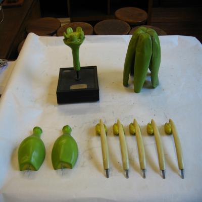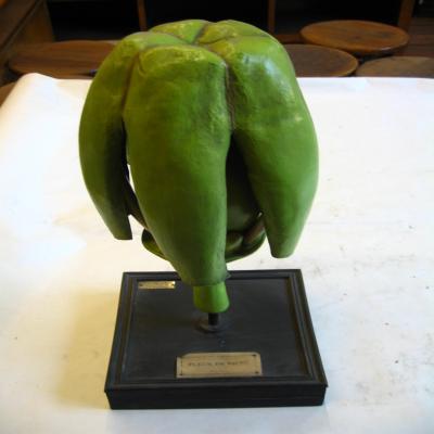 Modelo de una flor de Vitis sp. (Vid). Se observa un botón floral en el que los órganos sexuales de la flor están protegida por el perianto (envoltura protectora de la flor, formada generalmente por cáliz y corola). El perianto es pentalobulado, y al separarlo podemos ver cinco estambres con las anteras amarillas y un ancho y ovalado pistilo. El modelo se puede descomponer en nueve piezas (sin contar el soporte); el perianto, los cinco estambre se pueden separar, y el pistilo se separa y divide en dos piezas, pudeindose ver el ovario.