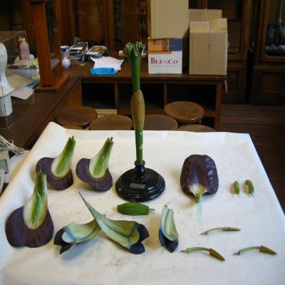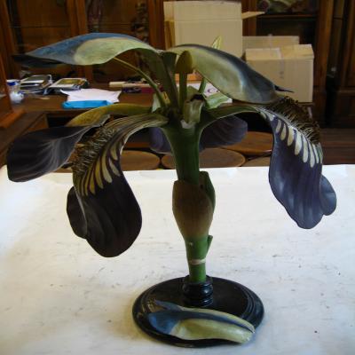 Vegetal. Angiospermas. Clase Liliopsida (Monocotiledóneas). Fam. Iridaceae Modelo de flor de Iris germanica (Lirio azul). Grandes dimensiones. La flor tiene tres sépalos extendidos y curvados hacia fuera, de forma ovada y color violáceo. Son glabros excepto la nervadura central cubierta de pelillos bastante altos, blanco amarillentos. Los pétalos son tres también (sólo se conserva uno), se extienden erectos y se doblan sobre la parte fértil de la flor; son azulados con los laterales blancos. Tanto sépalos como pétalos están unidos en la base al tubo floral situado sobre el ovario. Los estilos se dividen hacia el ápice convirtiéndose en tres ramificaciones petaloides (una se ha desprendido). Tres estambres curvos hacia fuera, con las anteras amarillas (una antera rota). Se puede desmontar en 13 piezas (sin contar el soporte): se separan los tres sépalos, los pétalos (sólo se conserva uno, de los otros dos sólo la base), los tres estambres, las ramificaciones petaloides como dos piezas (el conjunto y una que se ha desprendido), y el ovario se puede abris mostrando el interior. Las diferentes piezas están unidas por enganches metálicos.