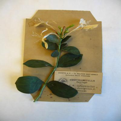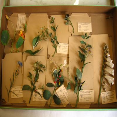 En una caja-expositor con la tapa de cristal. Cada planta lleva una etiqueta escrita a máquina con la siguiente inscripción en francés: "HERBIERS ARTIFICIELS. DEPOSÉ. HACHETTE & Cie, - 79, BOULEVARD SAINT-GERMAIN. Collection Marie FORTIER", y el resto de los datos en francés: nombre común, la familia, el nombre científico, característica o uso (medicinal, venenoso..) y el número de planta (escrito en descripción genérica para cada planta).