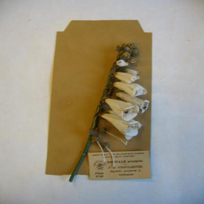 8-Digital púrpura. Digitalis purpurea L. (Fam. Scrophulariaceae). Venenosa. Planta nº25. Flores pedunculadas, unilaterales y algo péndulas, muy vistosas. Cáliz pentámero, verde. Corola en forma de tubo ancho apenas lobulado en la porción distal, de color blanco (deberían ser púrpuras, quizá la tela hay perdido el color) con manchitas oscuras. Androceo formado por 4 estambres didínamos dos más largos que los otros dos, fusionados a la corola y cuyas anteras se disponen en la parte superior del tubo de la corola. Gineceo bicarpelar, con ovario súpero.