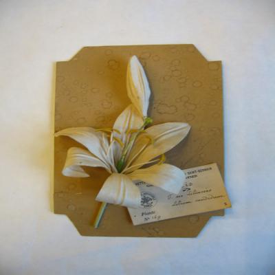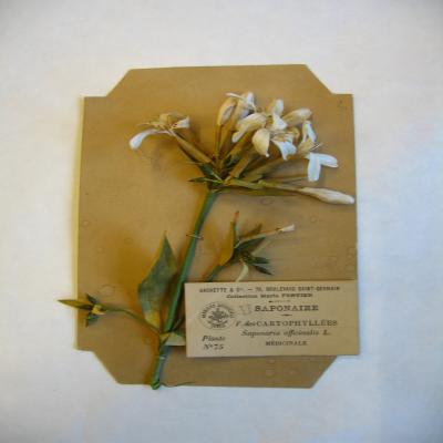 En una caja-expositor con la tapa de cristal. Cada planta lleva una etiqueta escrita a máquina (la de Lilium candidum con partes a bolígrafo) con la siguiente inscripción en francés: "HERBIERS ARTIFICIELS. DEPOSÉ. HACHETTE & Cie, - 79, BOULEVARD SAINT-GERMAIN. Collection Marie FORTIER", y el resto de los datos en francés: nombre común, la familia, el nombre científico, característica o uso (medicinal, venenoso..) y el número de planta (escrito en descripción genérica para cada planta).