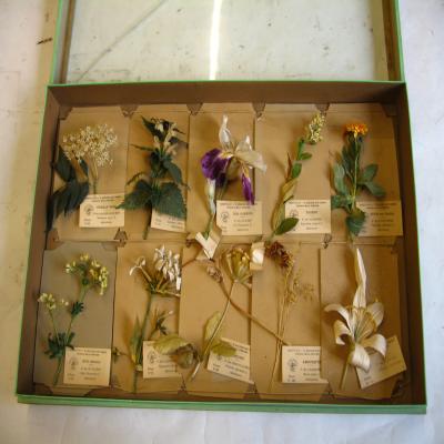También hay sueltas por la caja dos muestras secas de plantas naturales, de una sólo se conserva el tallo, de la otras hojas y flores. Cada una tiene una papel unido al tallo, con el nombre de la especie: