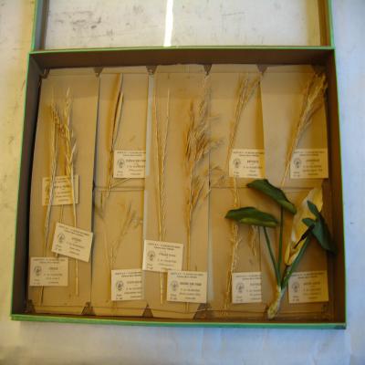 En una caja-expositor con la tapa de cristal. Cada planta lleva una etiqueta escrita a máquina con la siguiente inscripción en francés: "HERBIERS ARTIFICIELS. DEPOSÉ. HACHETTE & Cie, - 79, BOULEVARD SAINT-GERMAIN. Collection Marie FORTIER", y el resto de los datos en francés: nombre común, la familia, el nombre científico, característica o uso (medicinal, venenoso..) y el número de planta (escrito en descripción genérica para cada planta).